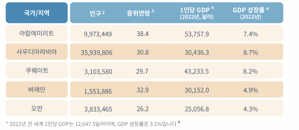 - 높은 구매력: 아랍에미리트의 1인당 GDP는 약 5만 3천 달러, 사우디아라비아는 약 3만 달러로 전 세계 평균(약 1만 2천 달러)을 크게 웃도는 강력한 소비력을 보유하고 있습니다.