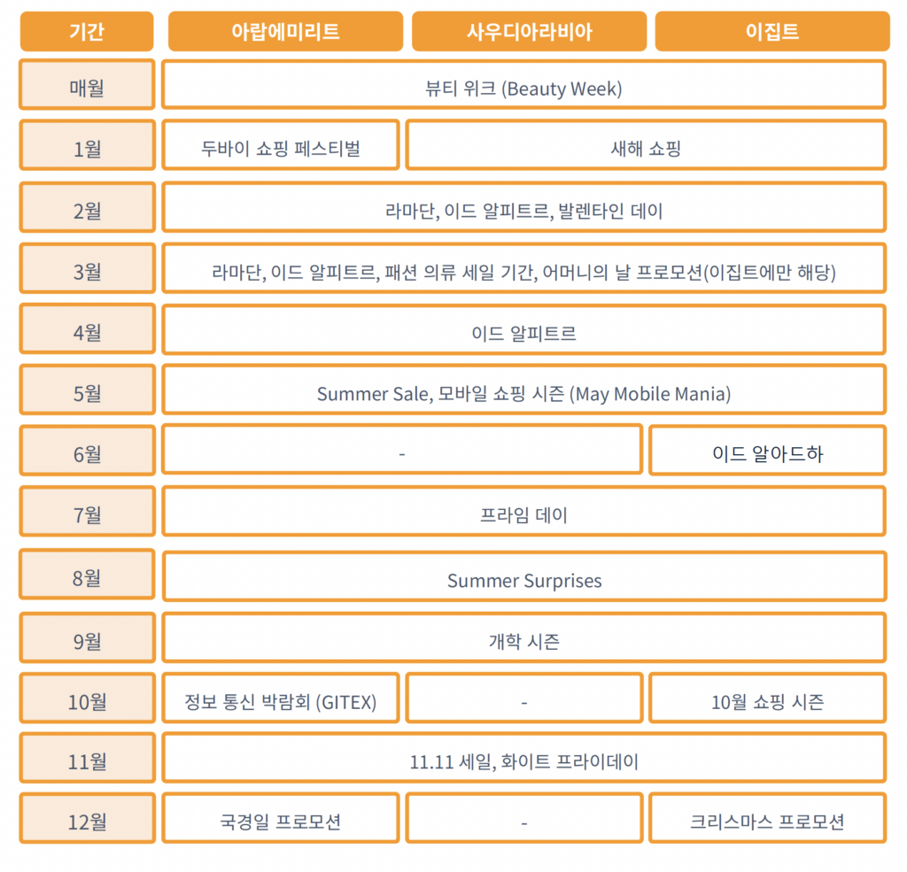 - 라마단(Ramadan, 3월경): 집에서 보내는 시간이 늘어나며 의류, 선물, 향수, 가전제품 수요가 폭발합니다.