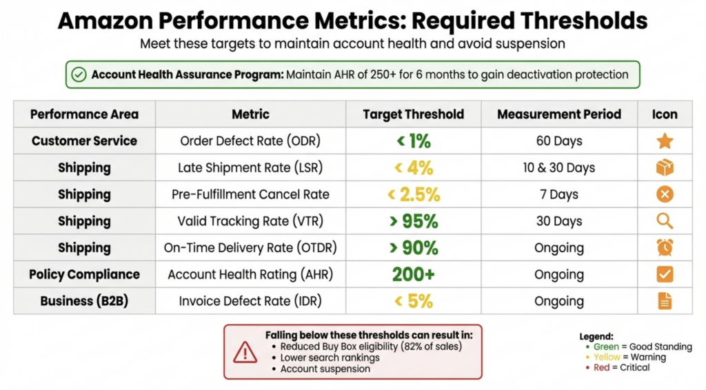 - 배송 지연: FBA를 쓰지 않는 ‘자체 배송(FBM)’의 경우, 배송 지연은 계정 정지의 지름길입니다. 가급적 FBA 이용을 권장합니다.